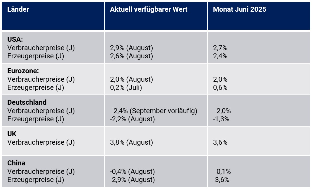 In der Eurozone ergab sich bei den Verbraucherpreisen in der Phase von Juni bis August mit unverändert 2,0 % keine Veränderung. In den USA kam es in diesem Zeitraum zu einem Anstieg in Höhe von 2,7 % auf 2,9 % und in Großbritannien zu einer Zunahme von 3,6 % auf 3,8 %. In Japan gaben die Verbraucherpreise in diesem Zeitfenster von 3,3 % auf 2,7 % nach. Im 3. Quartal 2025 stellte sich bei den Verbraucherpreisen in China im Verlauf ausgehend von 0,1 % im Juni ein Verfall auf -0,4 % per August 2025 ein. In Indien, das grundsätzlich von höheren Inflationsraten geprägt war, sank der Anstieg der Verbraucherpreise seit Oktober 2024 von 6,21 % auf 2,07 % (August 2025).